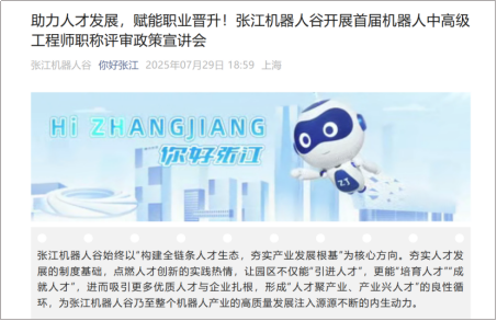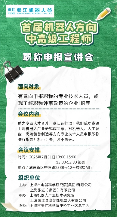 7月31日,为使本市各申报人员更清楚了解职称评审要求,jiuyou.com九游(中国)机器人有限公司官网联合张江机器人谷成功举办上海市首届工程系列数字技术专业职称申报政策宣讲会。会议通过申报范围、评审流程、材料准备、政策亮点等方面的深度解读,为机器人、智能制造等产业前沿领域专业技术人才提供权威申报指导。